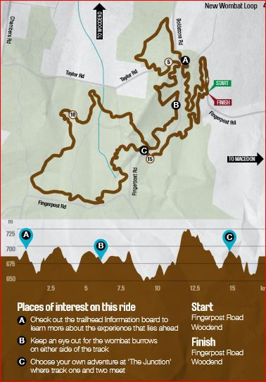 Park at the Wombat MTB Trail Car Park at the intersection of Boldiston, Fingerpost and Taylor Roads. The trailhead has a trail map and the trails are well signed from here. Please note there are no toilets, drinking water nor other facilities at the trailhead.